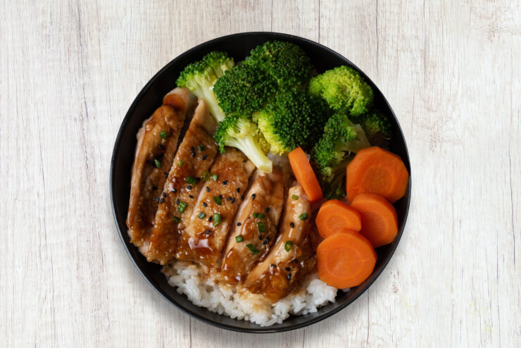 Tender chicken breast, served over quinoa and charred broccoli and carrots.