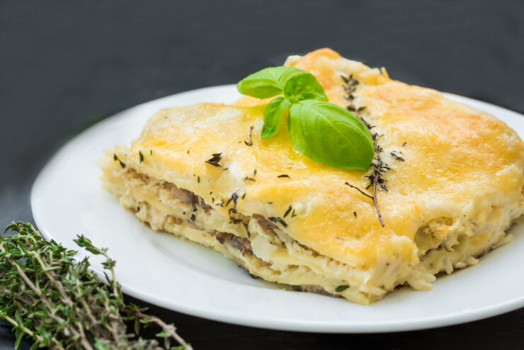 Shredded chicken thighs layered with green salsa, corn tortilla, refried beans and cheese.