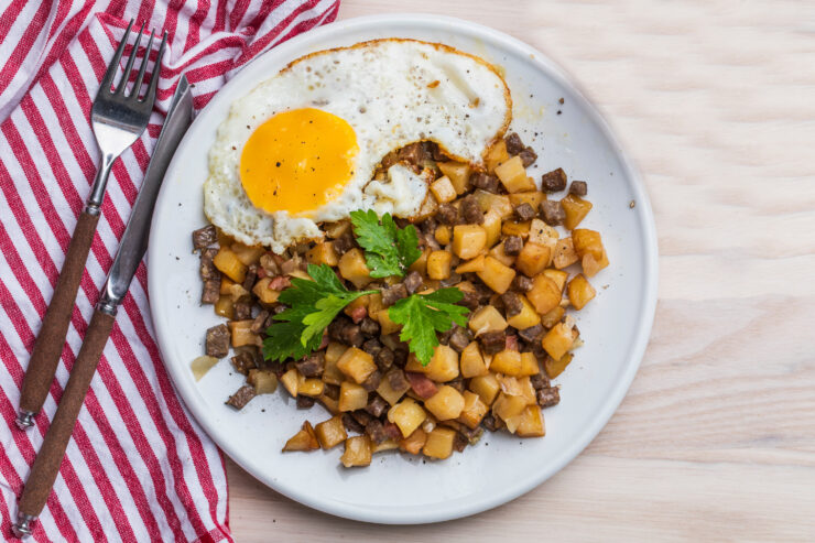 Fluffy eggs, cheese and veggies. Option to choose steak, cooked to your liking, or vegetarian!