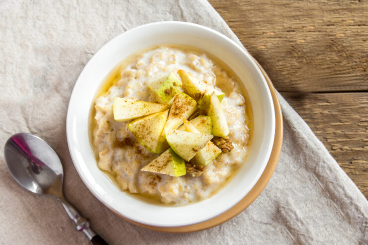 High fiber, steel cut oatmeal, crisp Fuji apples, cinnamon and light cream.